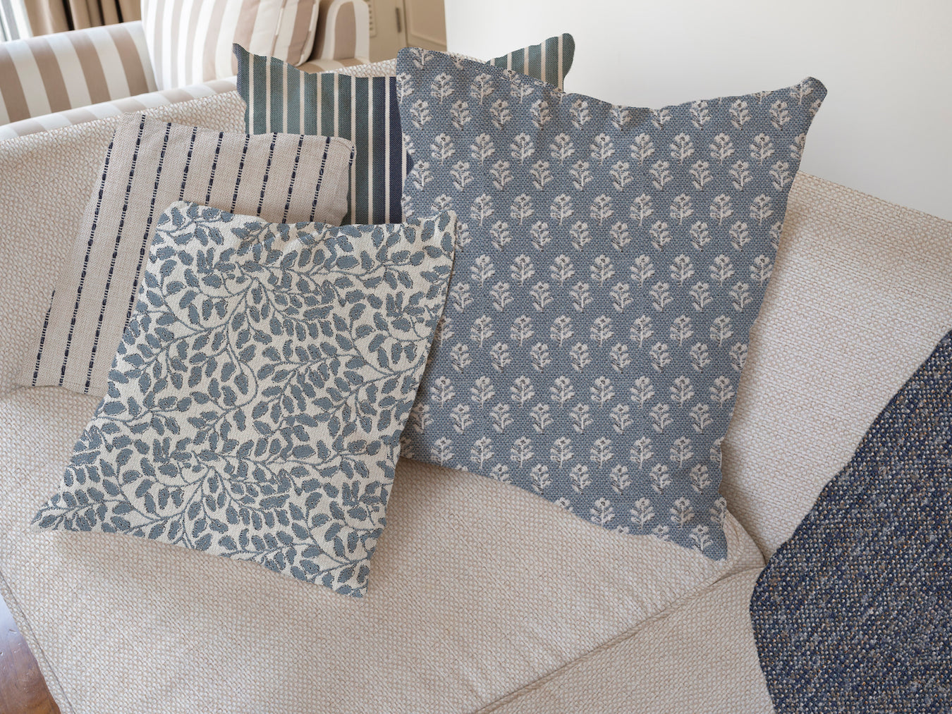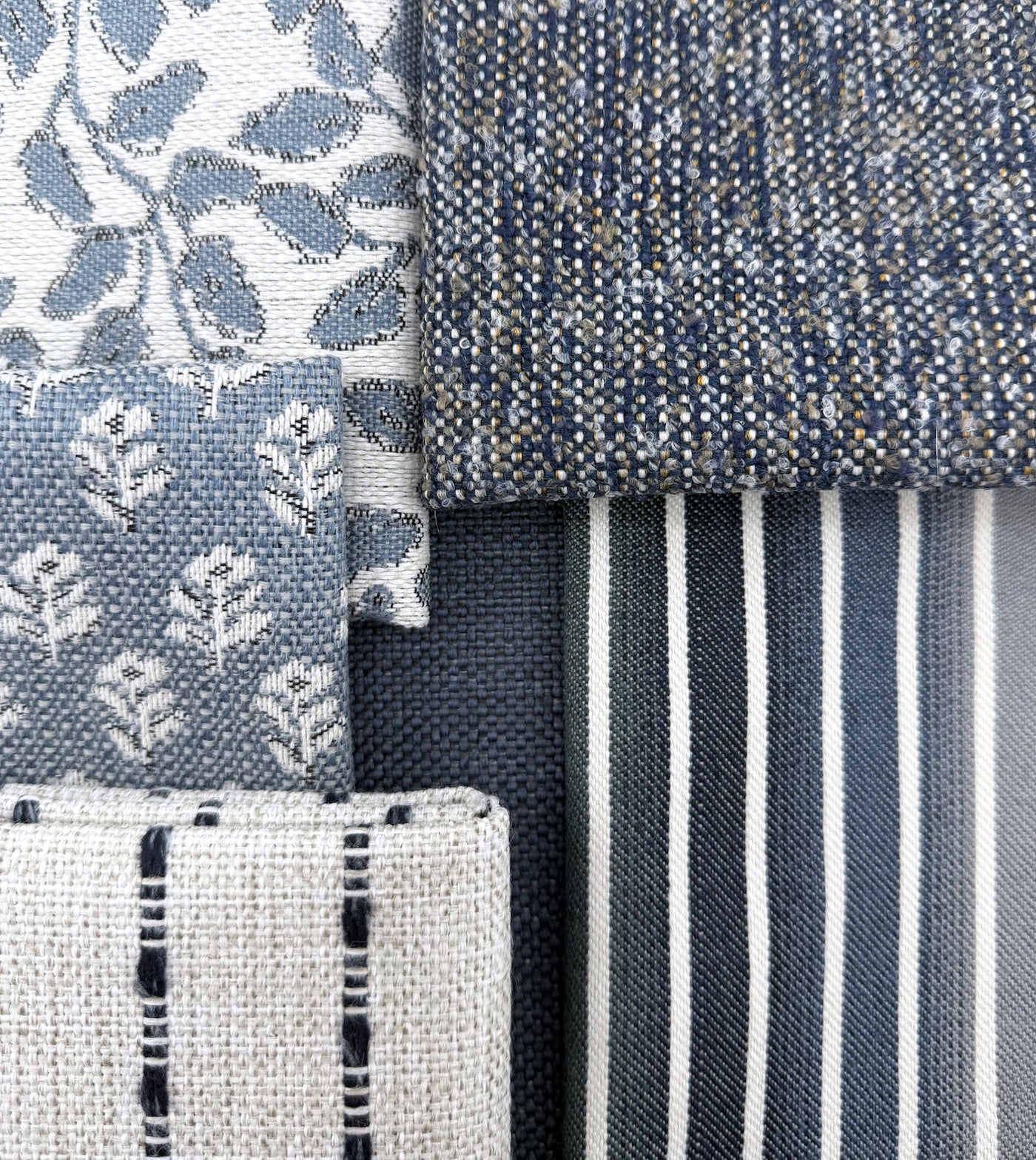 Together, these fabrics create a layered narrative that feels both coastal and classic — where cool tones meet natural warmth, and serenity meets strength.