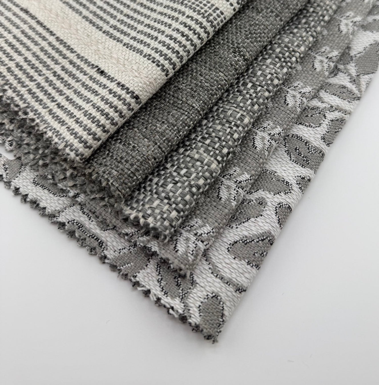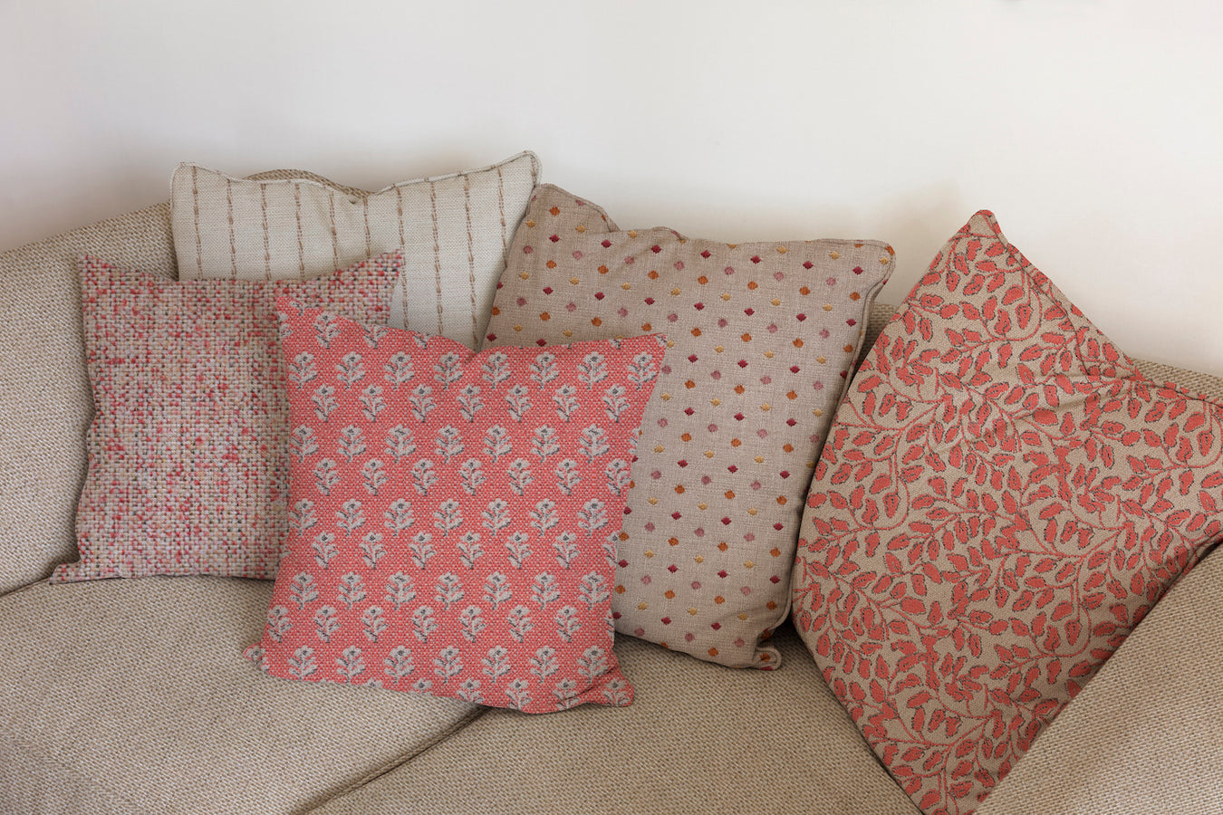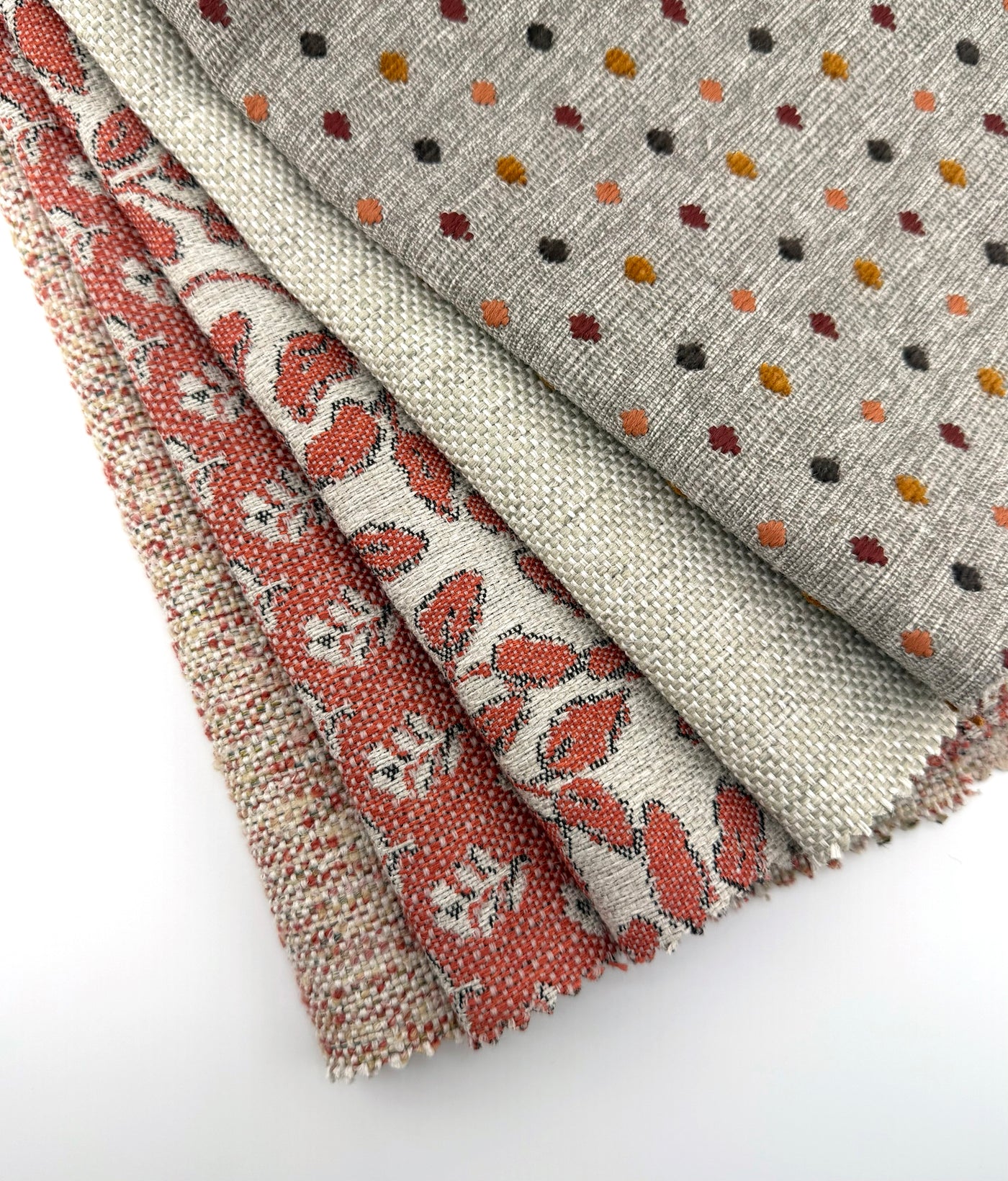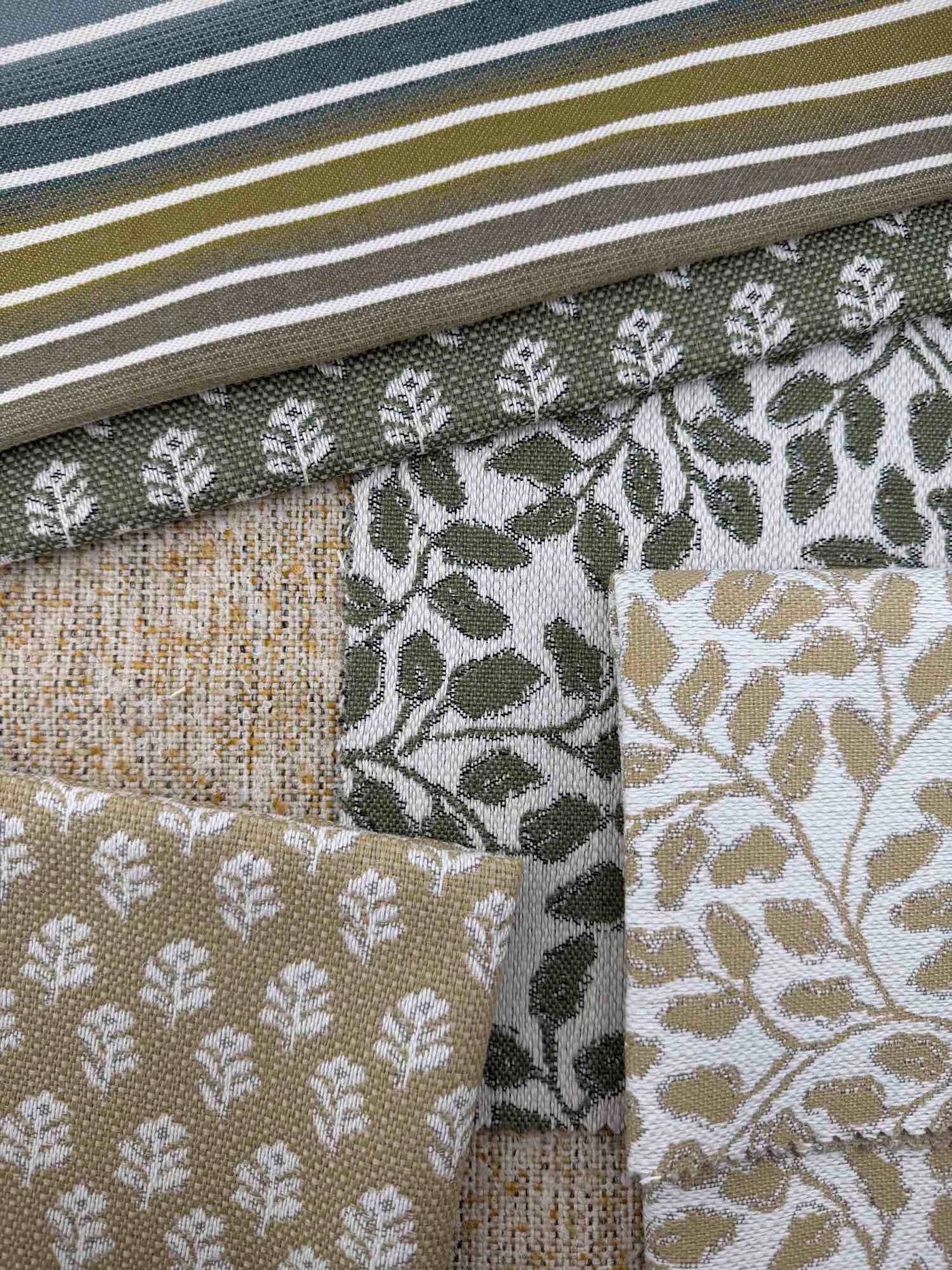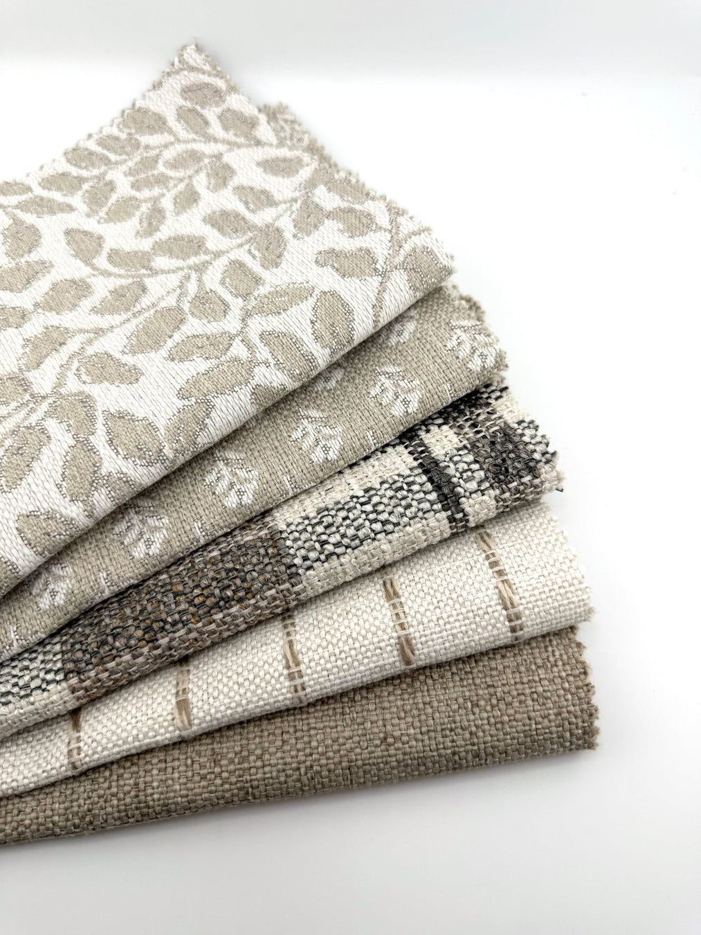 The beauty of this palette lies in its interchangeability — each pattern connects through shared yarns and natural tones that layer effortlessly across scales and textures. Whether styled together or paired with complementary neutrals, these fabrics create a collected, lived-in aesthetic that feels timeless and tactile.